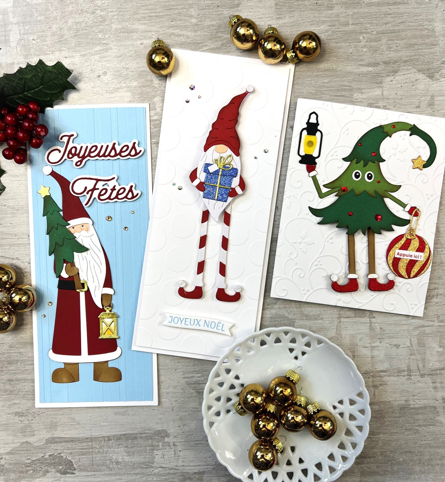 Interactive Christmas card workshop taught by Johanne Bérubé from ÇaFabrik. During this workshop, you will make three original cards! A little touch of electricity! That's right, Douglas' street lamp, the dancing tree, lights up! An easy and, above all, fun technique to create and receive! You'll leave with Santa Claus from yesteryear, the dancing gnome, and Douglas. A guided workshop for all levels with electrifying techniques! You'll receive all the materials you need to make the three cards.